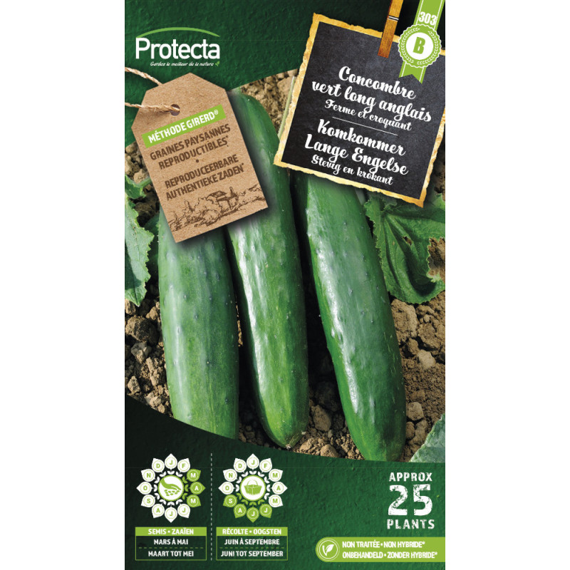Les semences de concombre Marketer Bio PROTECTA produisent un fruit lisse et vert foncé, d'une longueur de 20 à 25 cm et sans amertume. Cette variété robuste est adaptée à la culture en pleine terre ou sous abri, avec un semis en godets ou directement en place de mai à juin.