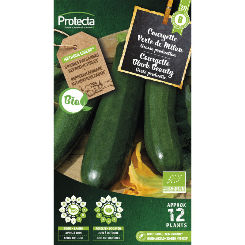 Ces semences biologiques produisent une variété buissonnante classique, facile à cultiver, offrant une production abondante de courgettes allongées d'un vert foncé et brillant. Le semis s'effectue en godets ou directement en pleine terre de mai à août.