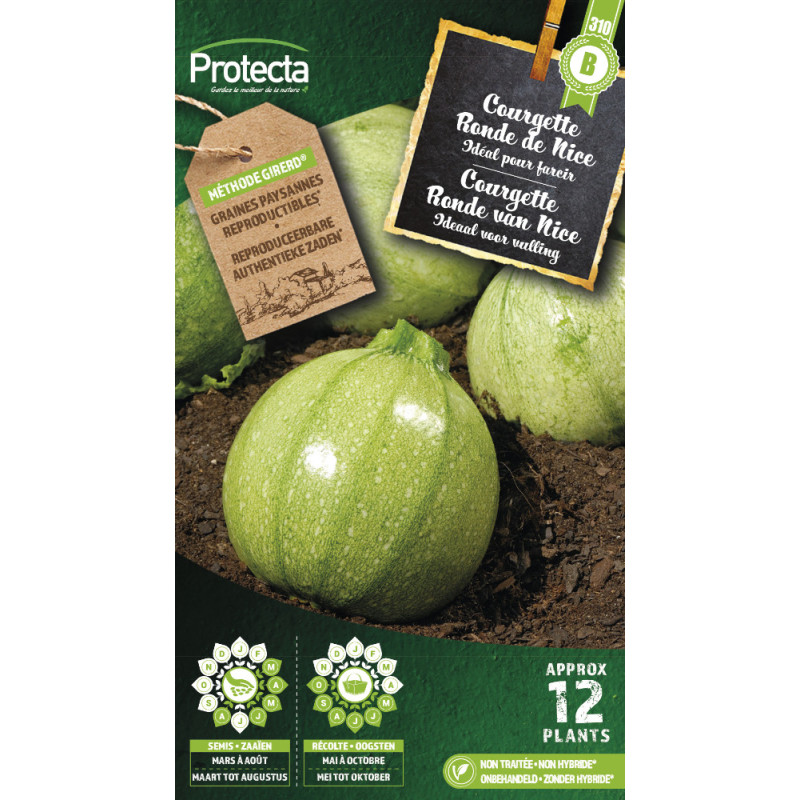 La variété très hâtive Ronde de Nice PROTECTA produit des fruits sphériques au développement non coureur. Le semis s'effectue en godets pour une mise en place en mai ou directement en pleine terre de mai à août.