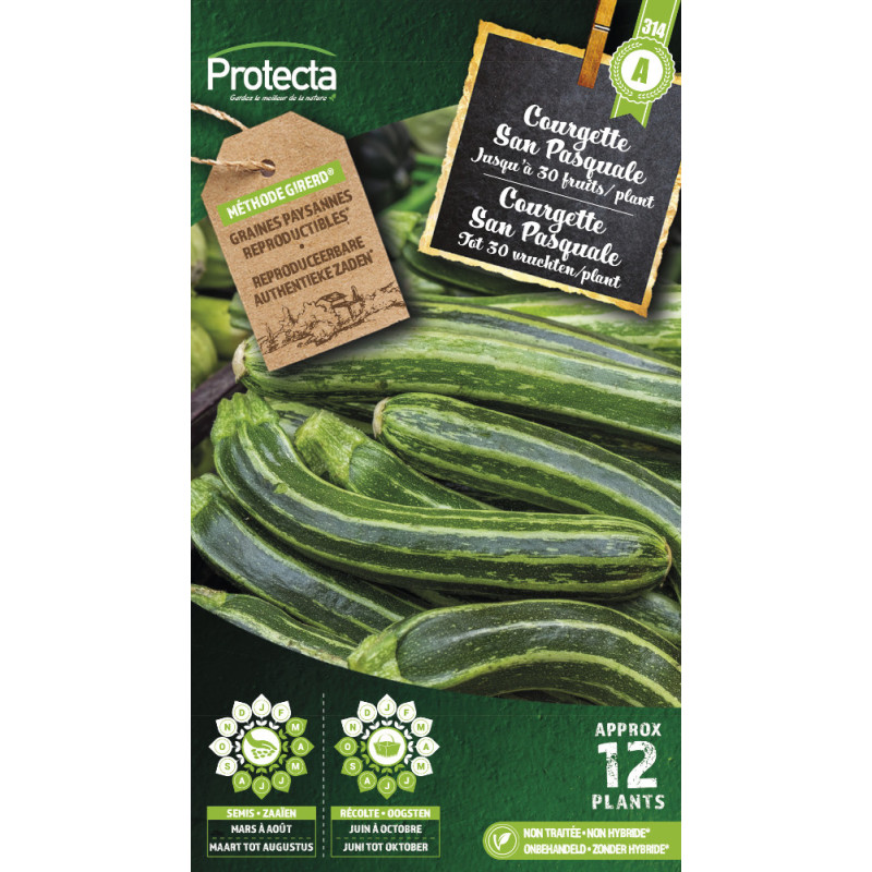La variété San Pasquale produit des courgettes vert foncé mouchetées de crème à la forme côtelée. Cette plante compacte est adaptée pour les cultures de jardin et forcées, avec un semis recommandé en poquets sous abri ou directement en pleine terre à partir de mai.