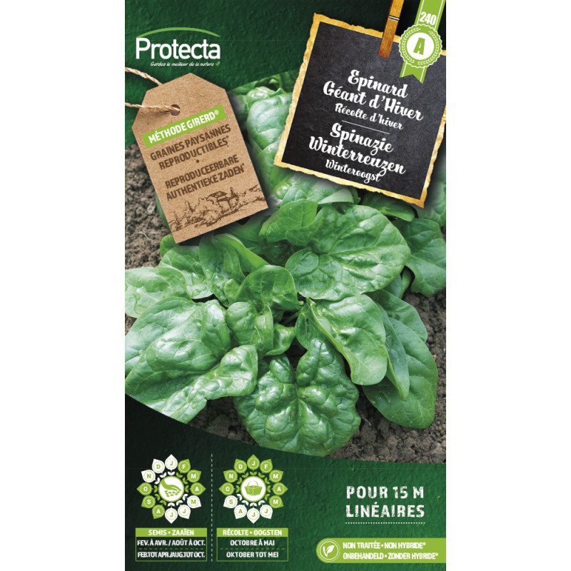 La variété d'épinard Géant d'Hiver PROTECTA se distingue par son rendement important et sa résistance au froid, permettant une culture hivernale. Son semis direct en lignes facilite l'obtention de plantes aux larges feuilles charnues.