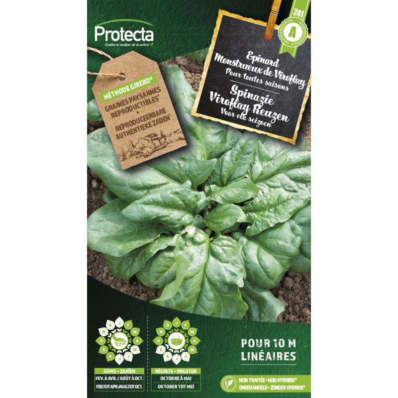 La variété Monstrueux de Viroflay se distingue par ses feuilles de taille exceptionnelle. Ces semences PROTECTA sont adaptées à la récolte en jeunes pousses et exigent un sol bien amendé, frais et une exposition ombragée pour les semis de printemps.
