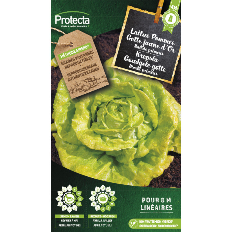 La variété Gotte jaune d'Or PROTECTA est recommandée pour les premiers semis sous abri, formant une petite pomme serrée au feuillage blond. Son développement rapide et son feuillage tendre conviennent au repiquage ou au semis direct avec éclaircissage.