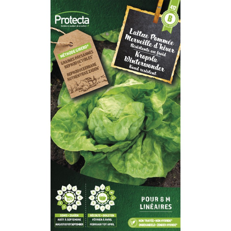 La laitue Pommée Merveille d'hiver PROTECTA produit une pomme de taille moyenne au feuillage vert et gaufré. Cette variété est particulièrement adaptée aux cultures d'hiver, exigeant un repiquage en terrain meuble et une protection contre les grands froids.