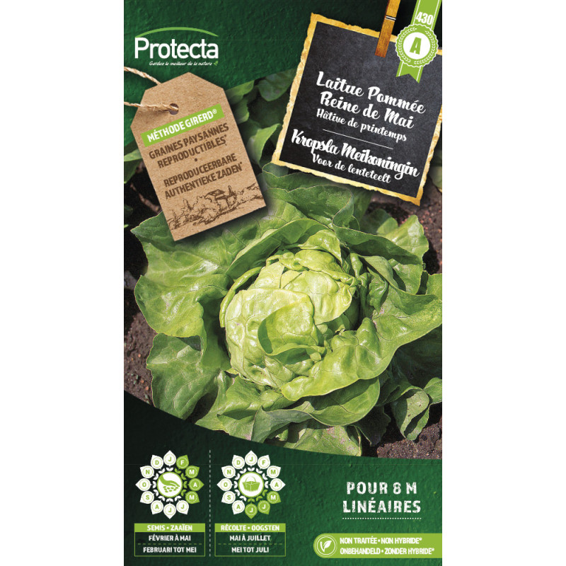 La laitue Pommée Reine de Mai PROTECTA est une variété de printemps et d'été, formant une pomme ronde et très ferme. Son semis en pépinière et sa reprise en terrain meuble et bien exposé conviennent à une culture vigoureuse aux feuilles vert blond.