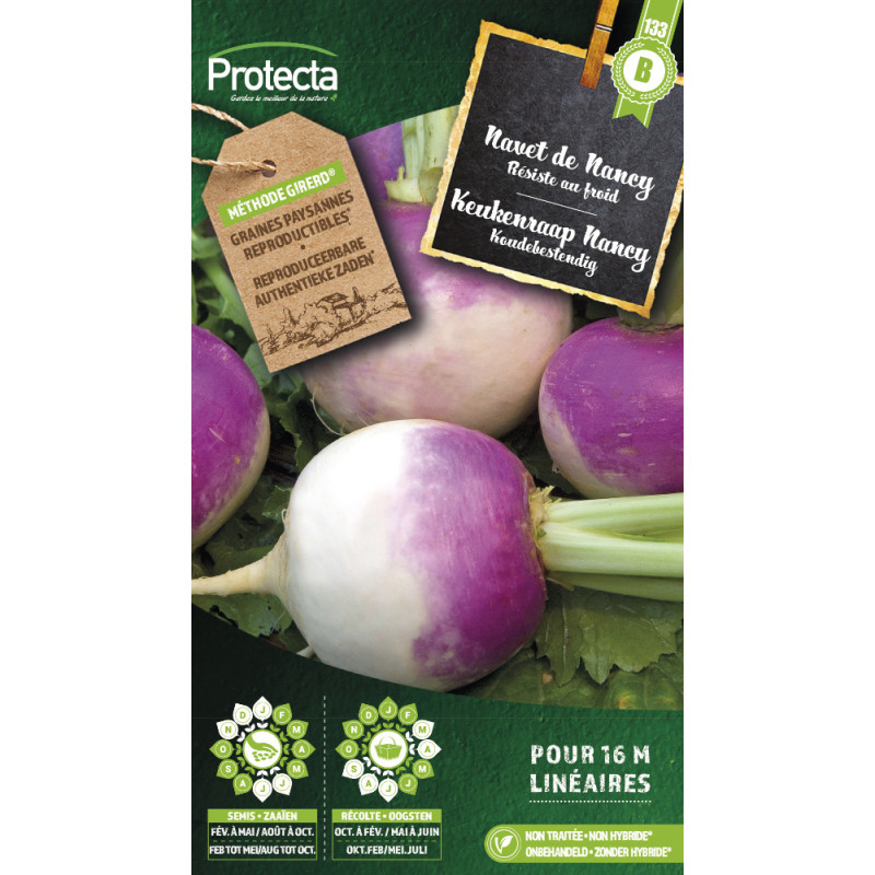 La variété précoce Semences de navet de Nancy PROTECTA produit en automne et hiver des racines bien rondes à la chair ferme. Ces navets blancs à collet violet se sèment directement en place et nécessitent des arrosages copieux en période de chaleur.