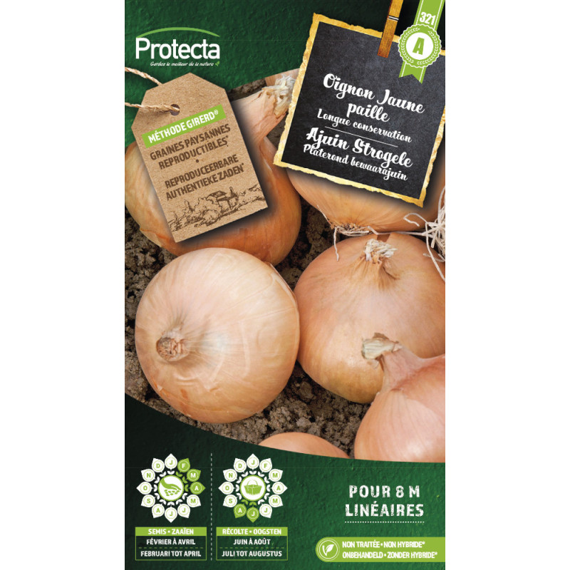 Cette semence d'oignon Jaune paille PROTECTA est une variété ancienne reconnue pour son rendement élevé et sa précocité. Elle offre une excellente conservation et des qualités gustatives appréciées, à semer en lignes espacées de 20 cm.