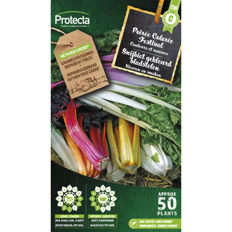 La poirée Colorée Festival PROTECTA se distingue par son feuillage multicolore aux cardes rouges, violettes, jaunes et orange, consommables avec les feuilles. Le semis s'effectue en place, avec un éclaircissage pour ne garder que le plant le plus vigoureux, et nécessite des arrosages fréquents.