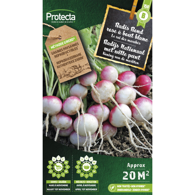 Les semences de radis Rond rose à bout blanc PROTECTA produisent une variété ronde au développement rapide et au goût savoureux. Le semis échelonné permet une culture facile en pleine terre presque toute l'année.