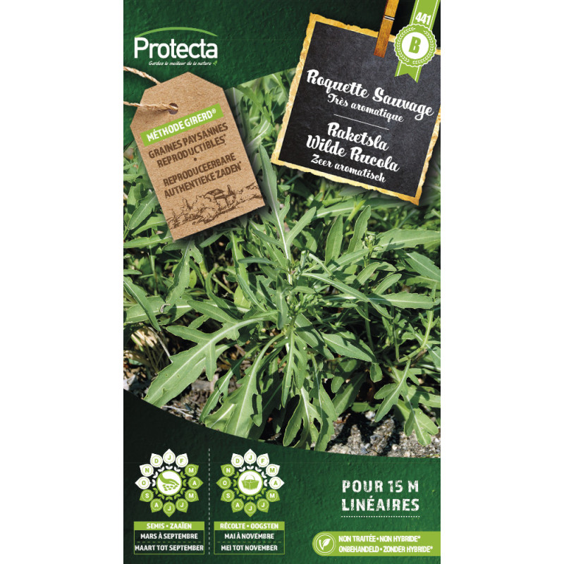 Les semences de roquette Sauvage PROTECTA produisent une plante à croissance lente, caractérisée par un feuillage plus petit et une saveur intense. Le semis s'effectue de mars à août, avec un éclaircissage recommandé pour un développement optimal.