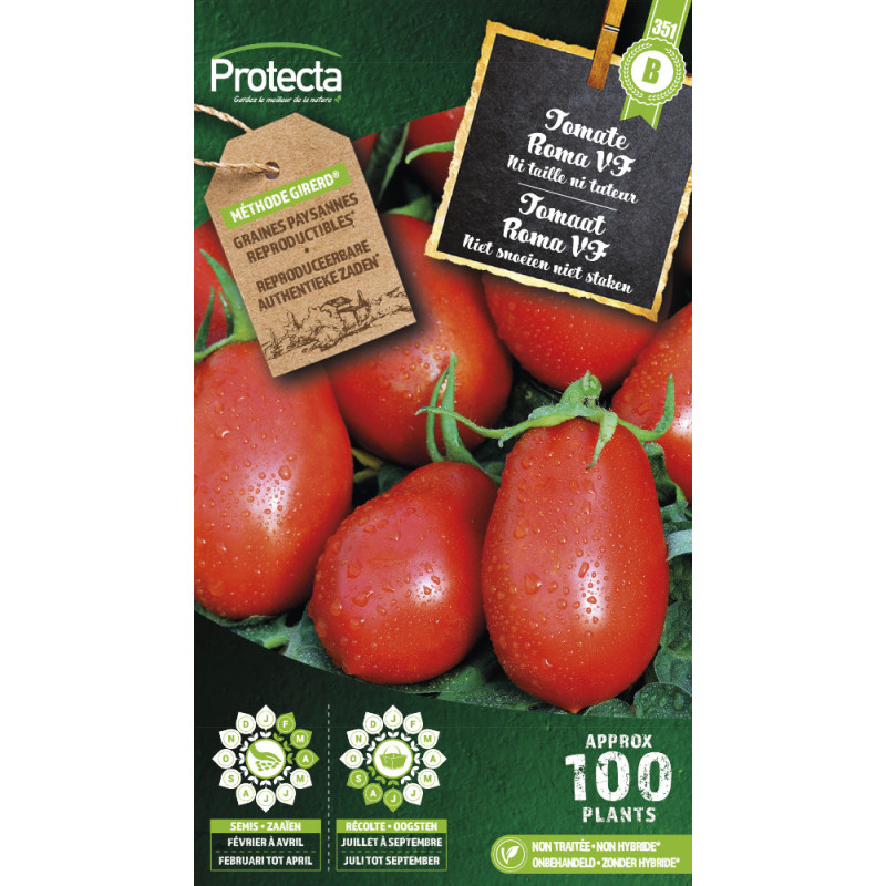 La variété Roma VF PROTECTA génère une abondance de fruits allongés de qualité supérieure, idéaux pour la préparation de coulis. Cette tomate ne requiert aucun tuteurage ni taille spécifique et se sème sous abri pour une mise en place au jardin à partir de mai.