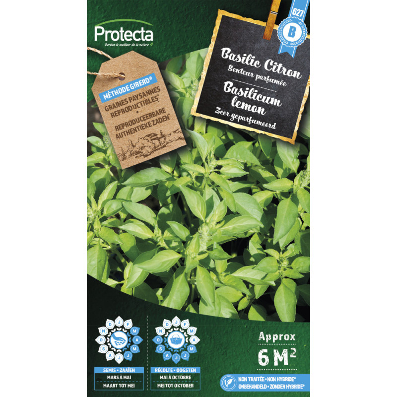 Les semences de basilic Citron PROTECTA produisent une plante au port compact et au feuillage aromatique intense, à la saveur distinctement citronnée. Le semis sous abri au printemps assure une levée rapide pour une plantation définitive après les gelées.