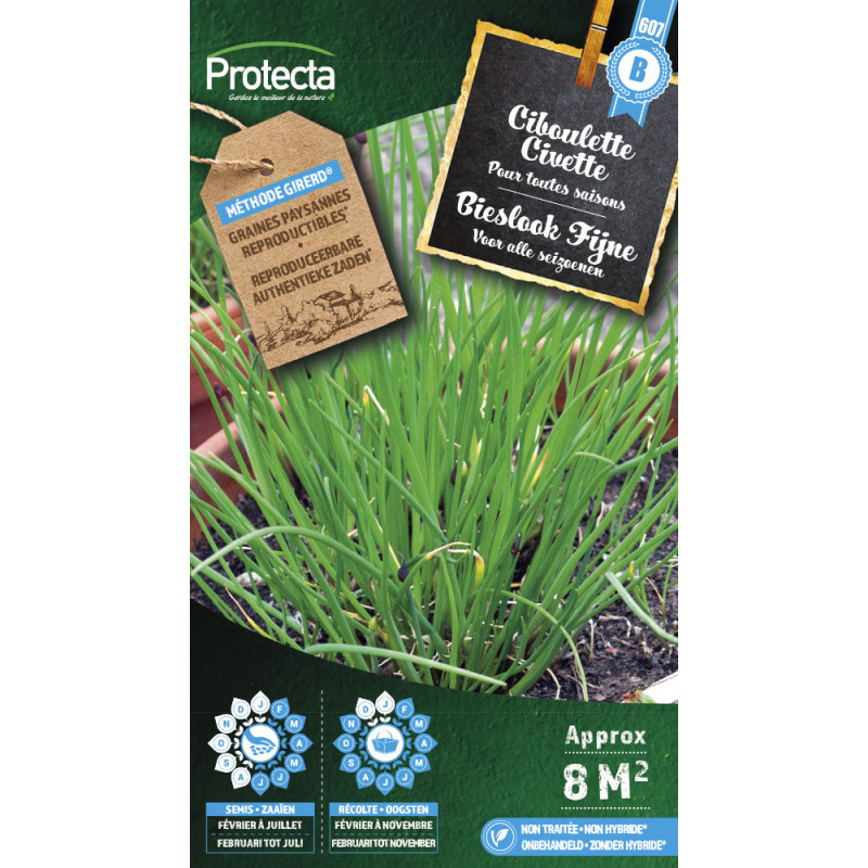 Les semences de ciboulette Civette PROTECTA produisent des feuilles tubulaires et creuses au goût doux d'oignon. Cette variété, adaptée à une culture facile en pleine terre ou en pot, est idéale pour les fines herbes.