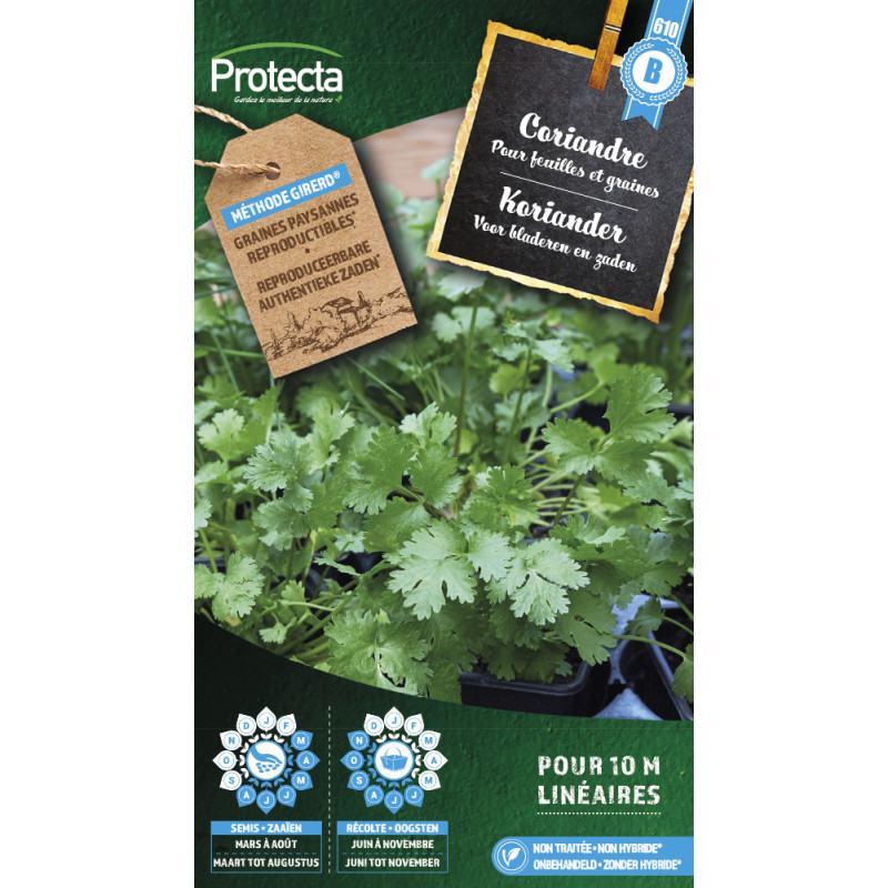 Les semences de coriandre PROTECTA produisent des feuilles au goût caractéristique pour la garniture et des graines utilisées comme condiment. Le semis direct s'effectue en lignes espacées de 25 cm, avec un éclaircissage à 4 feuilles pour conserver un plant tous les 20 cm.