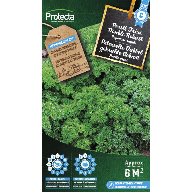 Le persil Frisé Double Robust PROTECTA se distingue par son feuillage vert foncé intensément découpé et son parfum puissant. Cette variété prolifique résiste au jaunissement et repousse rapidement après la récolte, convenant à la culture en pleine terre comme en pot.