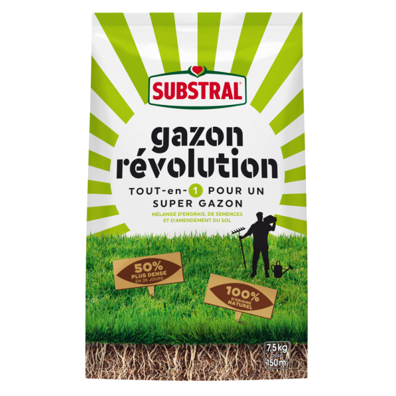 Le Gazon Révolution de Substral constitue une formule complète dédiée à l'entretien et à l'embellissement des pelouses. Ce mélange combine des semences sélectionnées, un engrais et un amendement pour le sol, offrant une action triple. Il est indiqué pour les surfaces présentant des zones dégarnies ou nécessitant un apport nutritif.
