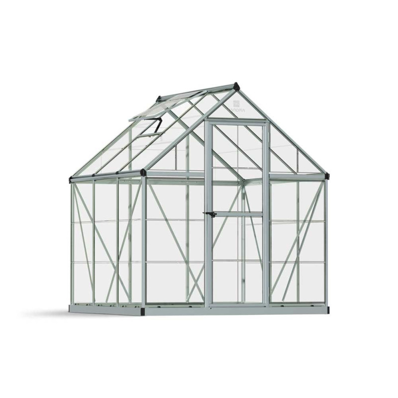 La serre en polycarbonate Harmony argentée CANOPIA de 3,3 m² est dotée d'une structure en aluminium et de parois en polycarbonate incassable, offrant une protection UV intégrale. Elle mesure 1,85 m de largeur et 1,86 m de longueur, avec une hauteur de 2,08 m.