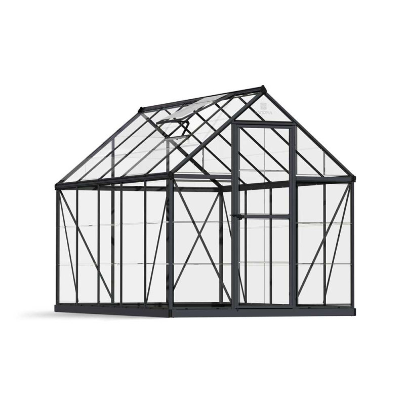 La serre en polycarbonate Harmony grise 5,4 m² CANOPIA, de dimensions 1,85 x 3,06 m, offre une structure en aluminium et des parois en polycarbonate quasi incassable. Elle assure une protection UV intégrale et une luminosité optimale pour vos cultures, avec une porte simple et une lucarne de toit.