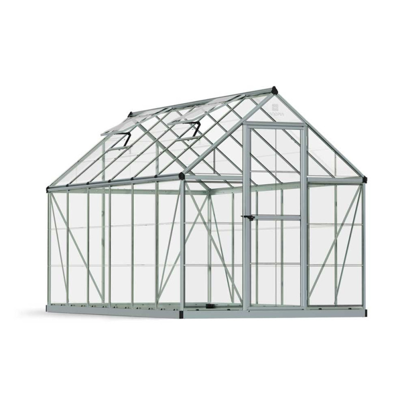 La serre en polycarbonate Harmony argentée CANOPIA de 6,6 m² (1,85 x 3,7 m) est dotée d'une structure en aluminium et de parois en polycarbonate incassable, offrant une protection UV intégrale. Elle intègre une porte simple et une lucarne de toit pour une ventilation optimale.