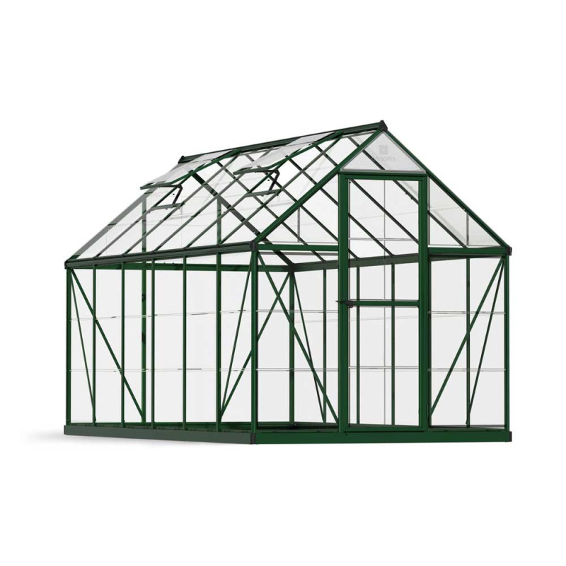 La serre en polycarbonate Harmony verte 6,6 m² CANOPIA, de 1,85 x 3,7 m au sol, est dotée d'une structure en aluminium et de parois en polycarbonate incassable, offrant une protection UV. Elle intègre une lucarne et une porte simple verrouillable.