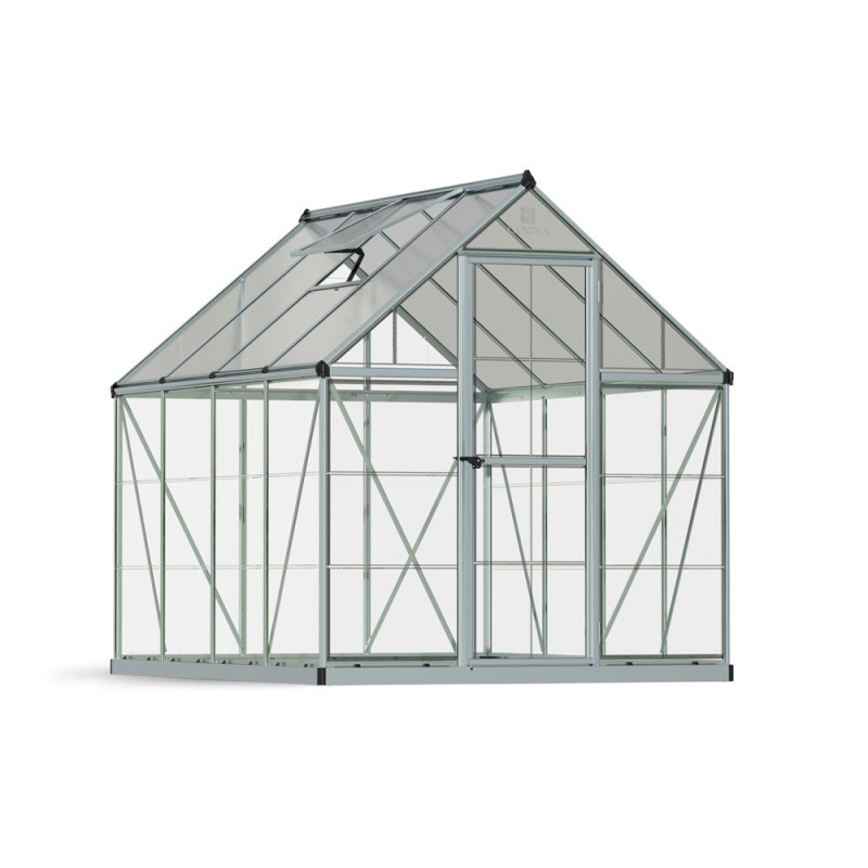 La serre en polycarbonate Hybrid argentée 4,4 m² CANOPIA offre une structure en aluminium robuste et des panneaux incassables. Ses dimensions intérieures sont de 1,85 x 2,47 m, avec une hauteur de 2,08 m.