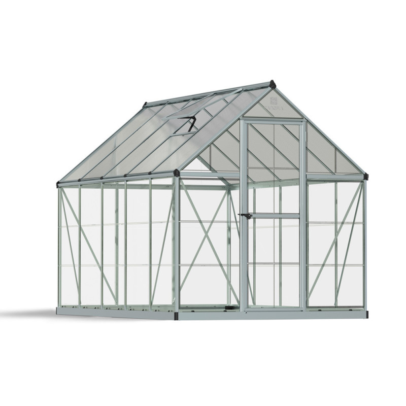 La serre en polycarbonate Hybrid argentée CANOPIA combine deux types de vitrage pour un environnement équilibré. Sa structure en aluminium robuste et ses panneaux en polycarbonate incassables assurent durabilité et protection UV. Elle offre une surface utile de 5,4 m².