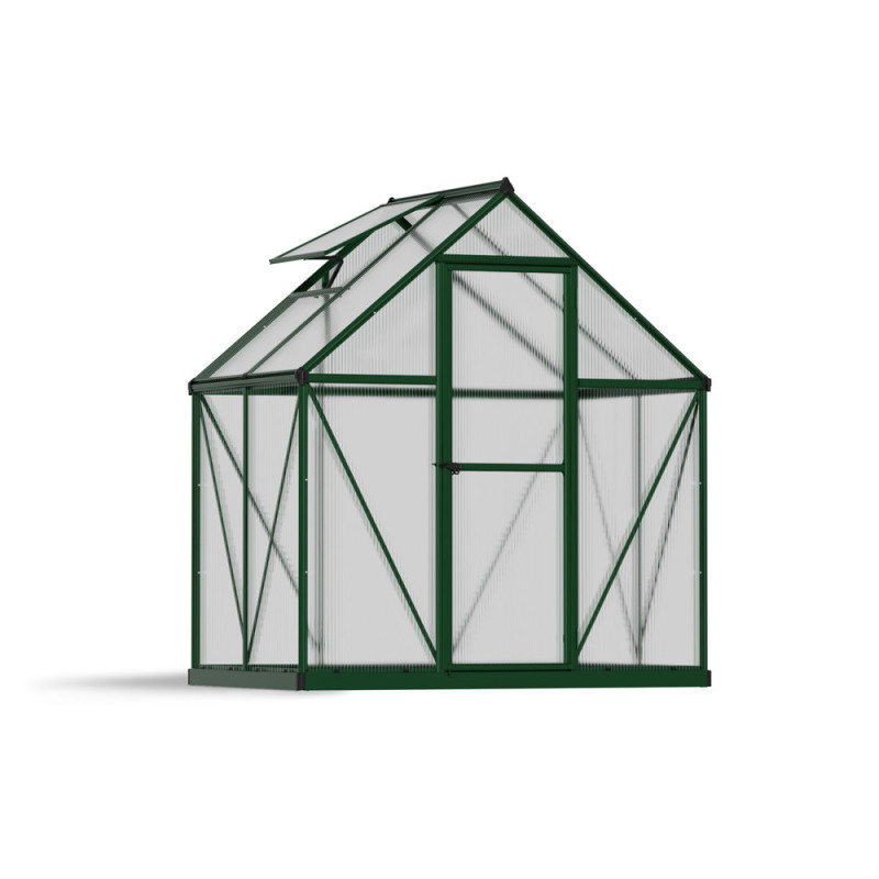 La serre en polycarbonate Mythos verte 2,2 m² CANOPIA, avec sa structure en aluminium et ses panneaux double paroi de 4 mm, assure une protection UV et une diffusion optimale de la lumière. Elle intègre une base en acier galvanisé, un évent de toit et un système de gouttière.