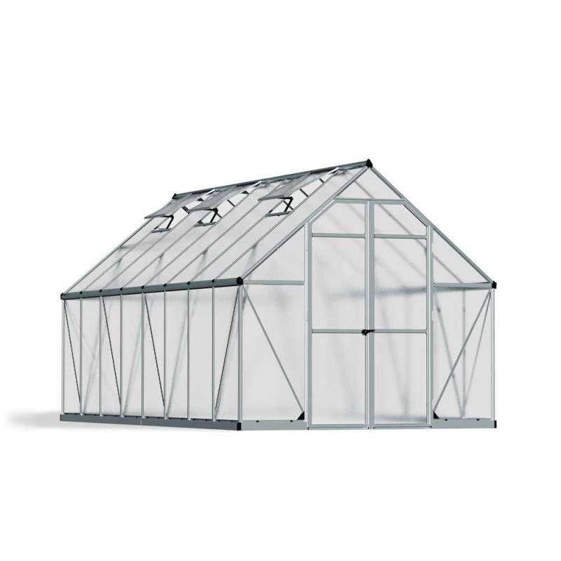 La serre en polycarbonate Essence argentée 11,5 m² CANOPIA, de 2,29 m de haut, intègre des panneaux incassables et une structure en aluminium robuste. Elle dispose d'une double porte (114,5 x 194,5 cm) et d'évents de toit pour une ventilation optimale.