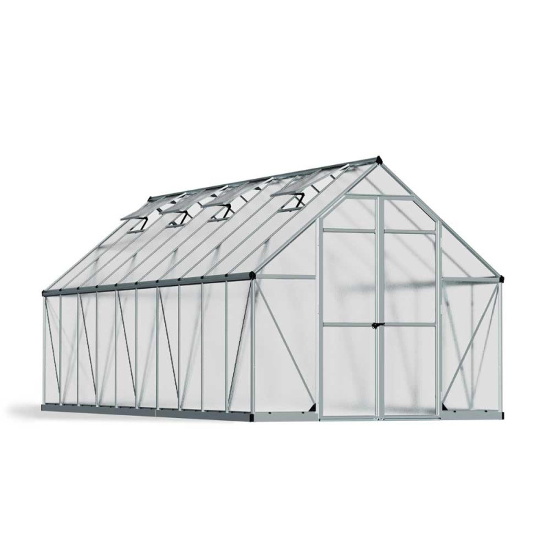 La serre en polycarbonate Essence argentée 14,4 m² CANOPIA offre un espace de culture généreux avec une hauteur de 2,29 m. Ses panneaux incassables et sa structure en aluminium robuste assurent stabilité et protection UV. Elle dispose d'une double porte et de deux évents de toit pour une ventilation optimale.