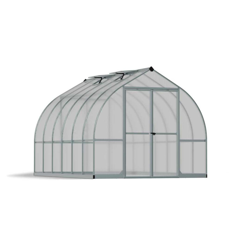 La serre en polycarbonate Bella argentée CANOPIA de 8,5 m² intègre une structure en aluminium et des panneaux double paroi de 6 mm. Sa forme en cloche améliore la résistance au vent et facilite l'évacuation de la neige.
