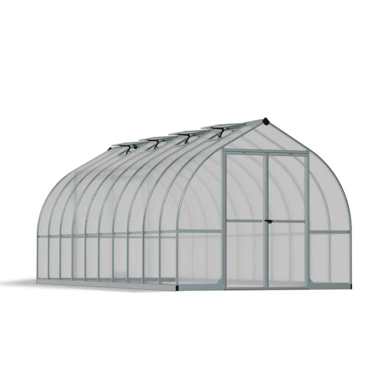 La serre en polycarbonate Bella argentée 14,1 m² CANOPIA, de 6,04 x 2,44 x 2,19 m, intègre des panneaux double paroi de 6 mm et une structure en aluminium. Sa forme en cloche améliore la résistance au vent et facilite le glissement de la neige, avec deux portes battantes et une base en acier galvanisé.