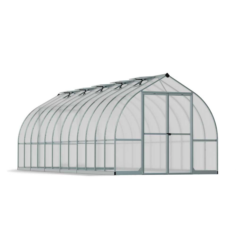 La serre en polycarbonate Bella argentée CANOPIA de 16,9 m² offre une structure en aluminium robuste et des panneaux en polycarbonate double paroi incassables. Sa conception en cloche résiste au vent et à la neige, avec une double porte de 118 x 171 cm et une hauteur de 2,19 m.