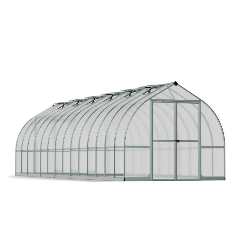 La serre en polycarbonate Bella argentée CANOPIA de 19,7 m² offre une structure en aluminium et des panneaux double paroi incassables de 6 mm. Sa conception en cloche résiste au vent et à la neige, avec une double porte de 118 x 171 cm et des évents de toit pour une aération optimale.