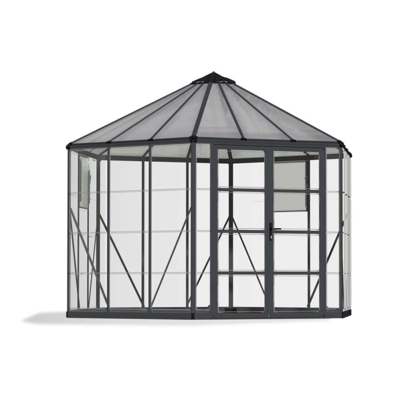 La serre hexagonale Oasis grise CANOPIA de 8,6 m² est dotée d'une structure en aluminium et de panneaux en polycarbonate transparents. Elle intègre une base en acier galvanisé, des portes battantes et une fenêtre latérale orientable. Ses dimensions sont de 3,63 x 3,16 x 2,89 m.