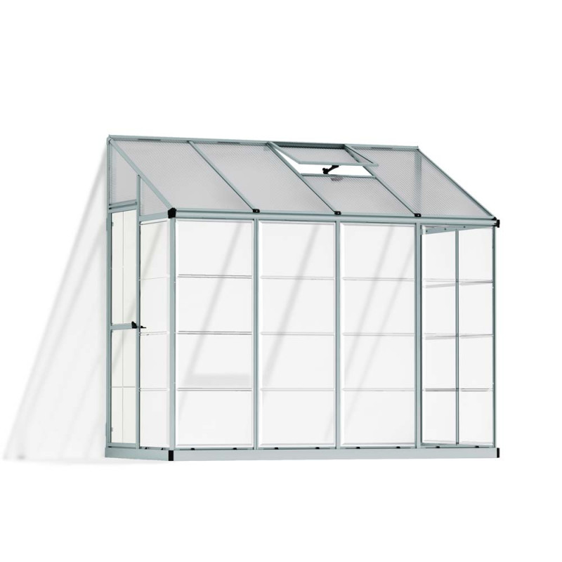 La serre adossée Lean To CANOPIA de 2,9 m² offre un vitrage en polycarbonate transparent et une structure en aluminium. Elle intègre une porte coulissante et une fenêtre réglable pour une ventilation optimale.