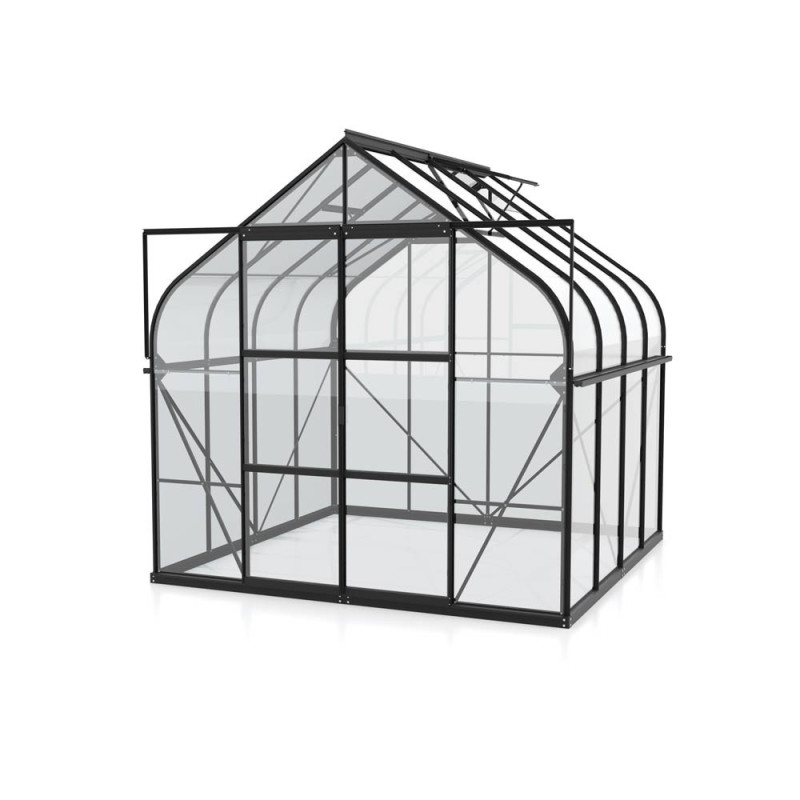 La structure de cette serre en aluminium est robuste et durable. Les profilés sont de couleur noire, offrant une finition moderne et sophistiquée. Le vitrage est réalisé en verre de sécurité cristallin d'environ 3 mm d'épaisseur, garantissant clarté et résistance. Les sections courbes du toit sont fabriquées en verre acrylique, assurant une transition fluide et une esthétique soignée. L'ensemble est conçu pour un montage aisé, permettant aux utilisateurs de l'assembler eux-mêmes.