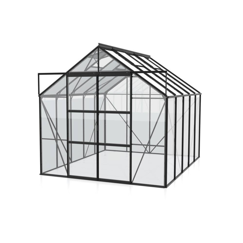 La Serre en verre Uranus noire 8,3 m² VITAVIA, certifiée TÜV, offre un espace généreux avec une hauteur de faîte de 2,48 m. Ses profilés en aluminium noir et son vitrage en verre de sécurité trempé de 3 mm assurent robustesse et clarté. Elle intègre une double porte coulissante et deux lucarnes de toit.