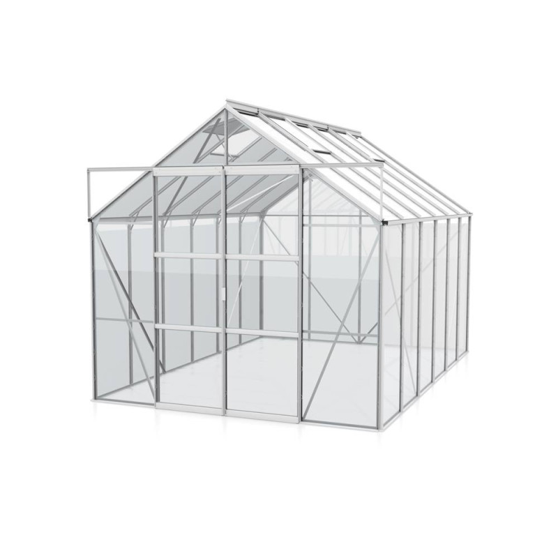 La serre en verre Uranus aluminium anodisé 9,9 m² VITAVIA offre un espace généreux avec une hauteur de faîte de 2,48 m et une double porte coulissante de 1,22 x 1,91 m. Ses profilés en aluminium anodisé et son vitrage en verre de sécurité trempé de 3 mm assurent robustesse et clarté.