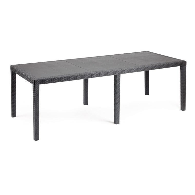 Fabriquée en polypropylène, cette structure synthétique présente une excellente résistance aux intempéries. Son aspect finition résine tressée apporte un caractère esthétique contemporain, tandis que sa couleur anthracite s'harmonise avec la plupart des décors de jardin. La hauteur standard de 72 cm assure un confort d'utilisation optimal avec des chaises de terrasse classiques.