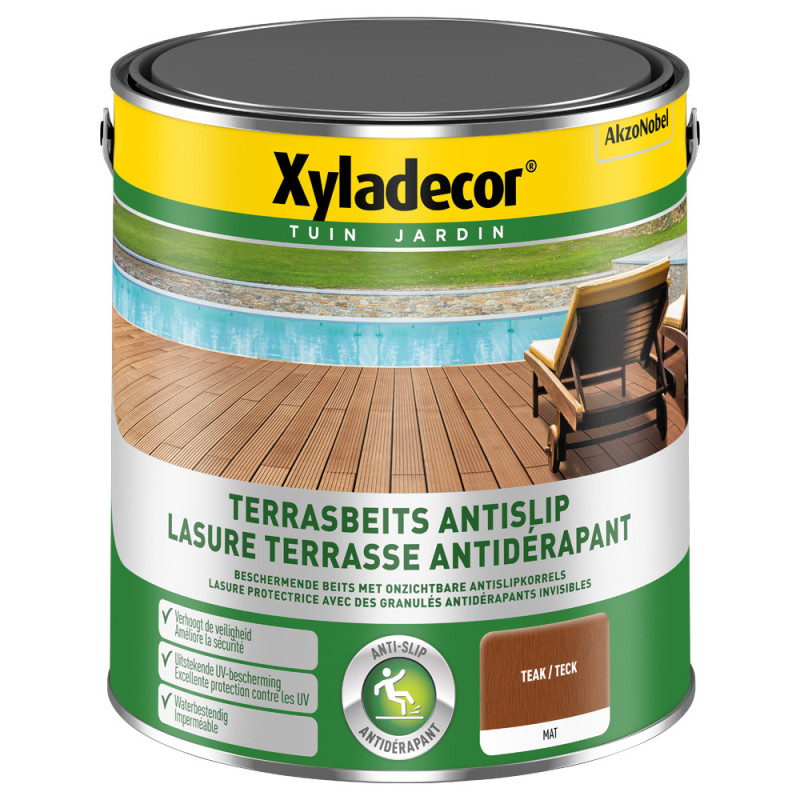 La lasure pour terrasse antidérapante de la marque Xyladecor est une solution mate en phase aqueuse, prête à l'emploi. Elle protège efficacement les terrasses et escaliers en bois, améliorant la sécurité et offrant une excellente protection UV. Facile à appliquer, elle promet un séchage complet en 6 h.
