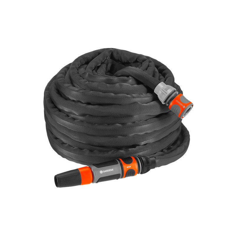 Conçu pour les surfaces sensibles, ce tuyau a un revêtement extérieur non éraflant. Il est livré avec un pistolet-arrosoir, un nez de robinet 18202/5305 et un nez de robinet 18200.