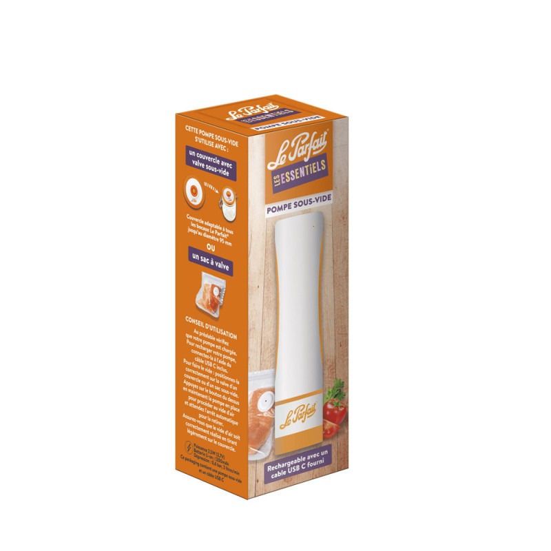 La pompe à main sous-vide rechargeable de la marque Le Parfait est un ustensile de cuisine conçu pour prolonger la fraîcheur des denrées alimentaires. Son fonctionnement repose sur l'extraction de l'air présent dans les récipients adaptés, créant ainsi un environnement sous vide qui ralentit considérablement l'oxydation et le développement bactérien. Cette méthode de conservation est applicable à une grande variété d'aliments, des restes de repas aux produits achetés en vrac.