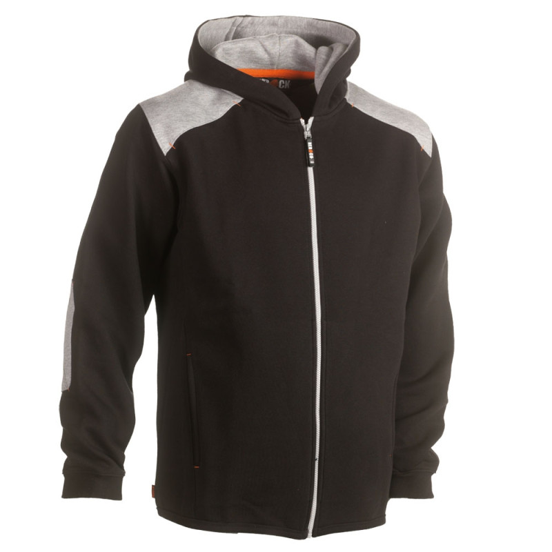 Ce pull est équipé d'un capuchon et d'une longue fermeture éclaire. Des pièces renforcées au niveau des épaules et des coudes ont été cousues.