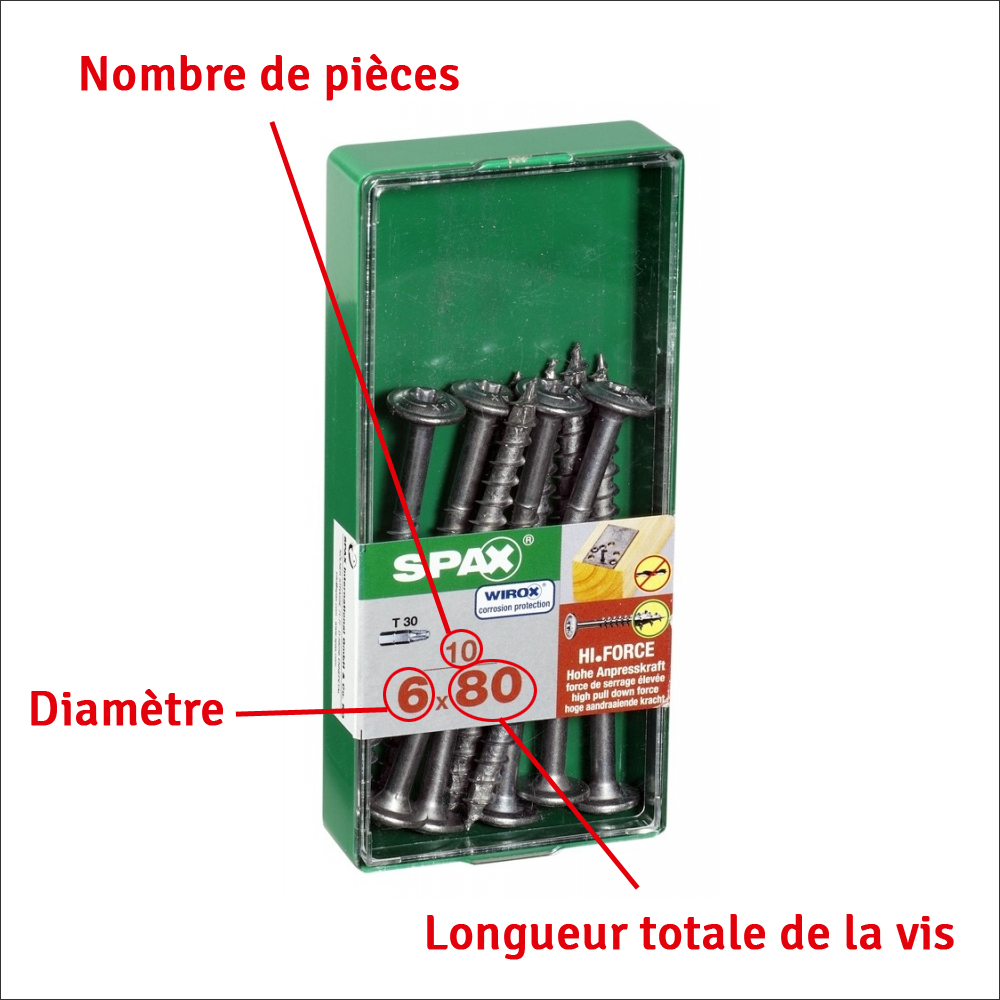 Vous trouverez sur l'étiquette du produit les informations suivantes : le diamètre et la longueur totale de la vis, ainsi que le nombre de pièces contenues dans la boîte.